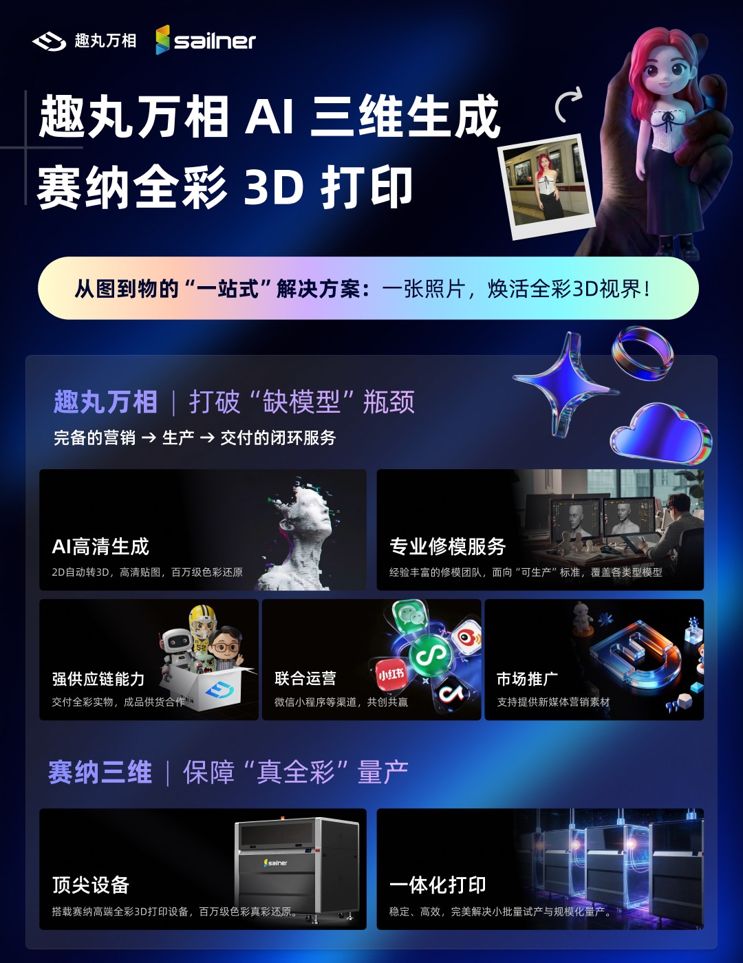 趣丸万相与珠海赛纳三维科技有限公司(以下简称“赛纳三维”)在2026年3月17日达成战略合作。依托趣丸万相领先的AI三维生成能力与赛纳三维国际顶尖的全彩3D打印设备,双方在业内率先推出“从图到物””的一站式解决方案,即消费者仅需用“一张2D照片”,就能收获工业级品质的“全彩3D实物”。